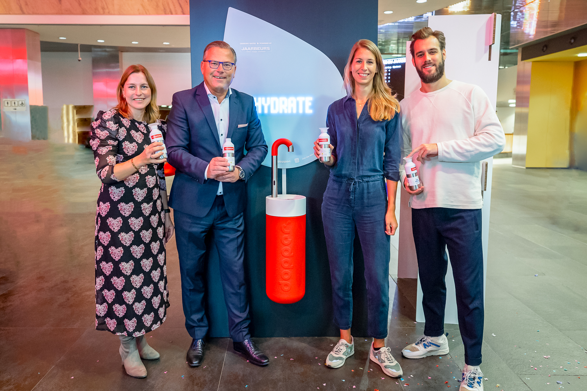 Eind september werd door Dopper-CEO Virginia Yanquilevich de Dopper Water Tap onthuld. “Gemak blijkt voor mensen de voornaamste reden om een wegwerpflesje te kopen. Ook vinden mensen publieke watertappunten moeilijk vindbaar. Ons antwoord hierop is de introductie van een herkenbaar vormgegeven, innovatieve watertap die speciaal ontworpen is om gedrag te helpen veranderen. We zijn blij dat we samen met Jaarbeurs ook gedragsverandering binnen de congres- en eventsector kunnen stimuleren. Zo dragen we gezamenlijk ons steentje bij aan een betere wereld”, licht Dopper-CEO Virginia Yanquilevich toe. Marloes van den Berg vult aan: “We doen er bij Jaarbeurs alles aan om onze CO2-uitstoot te reduceren met als uiteindelijk doel om in 2030 CO2-neutraal of zelfs CO2-positief te worden. Samen maken we het makkelijker en leuker om de aanschaf van wegwerpflesjes en bijbehorende plasticvervuiling tegen te gaan.”